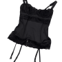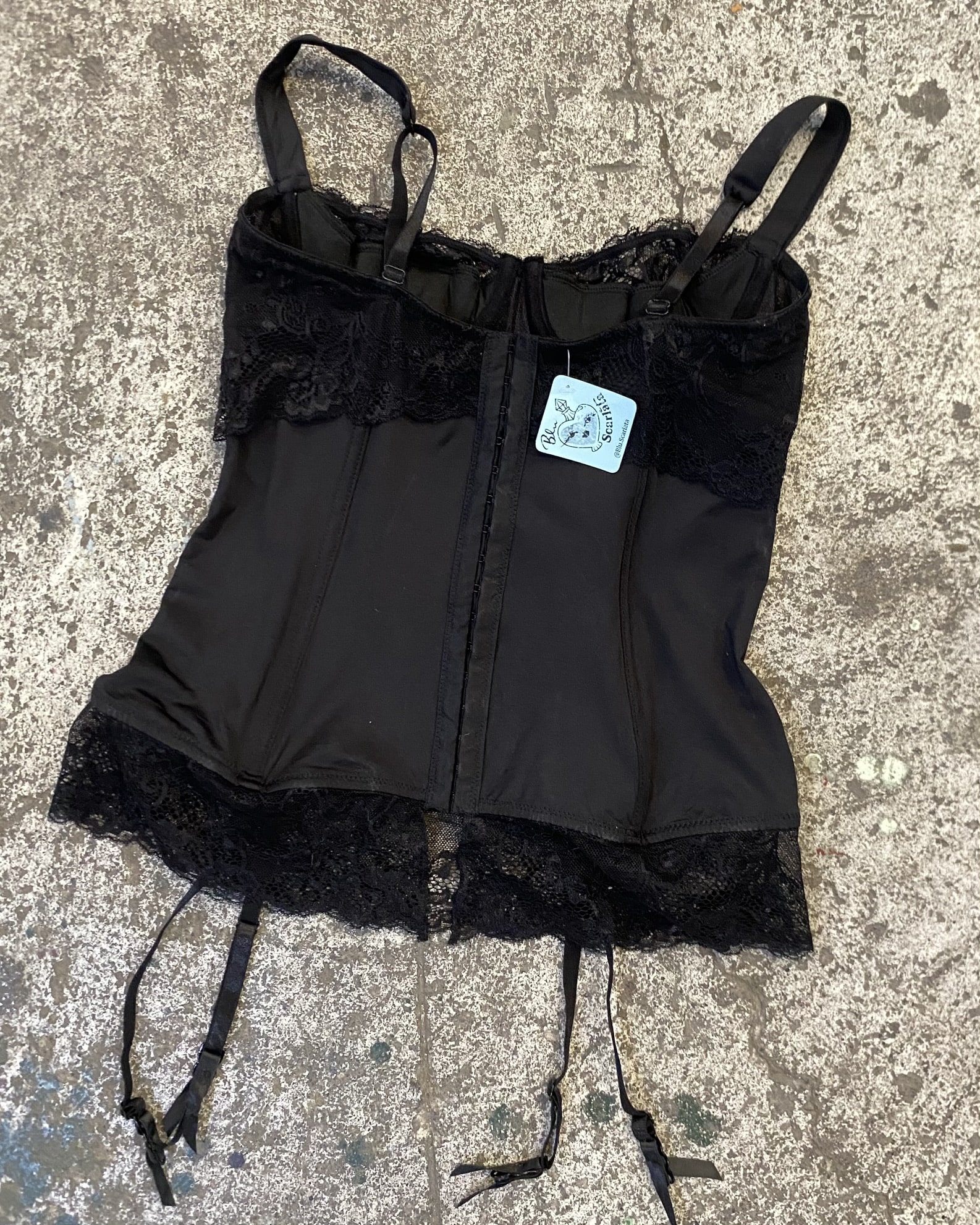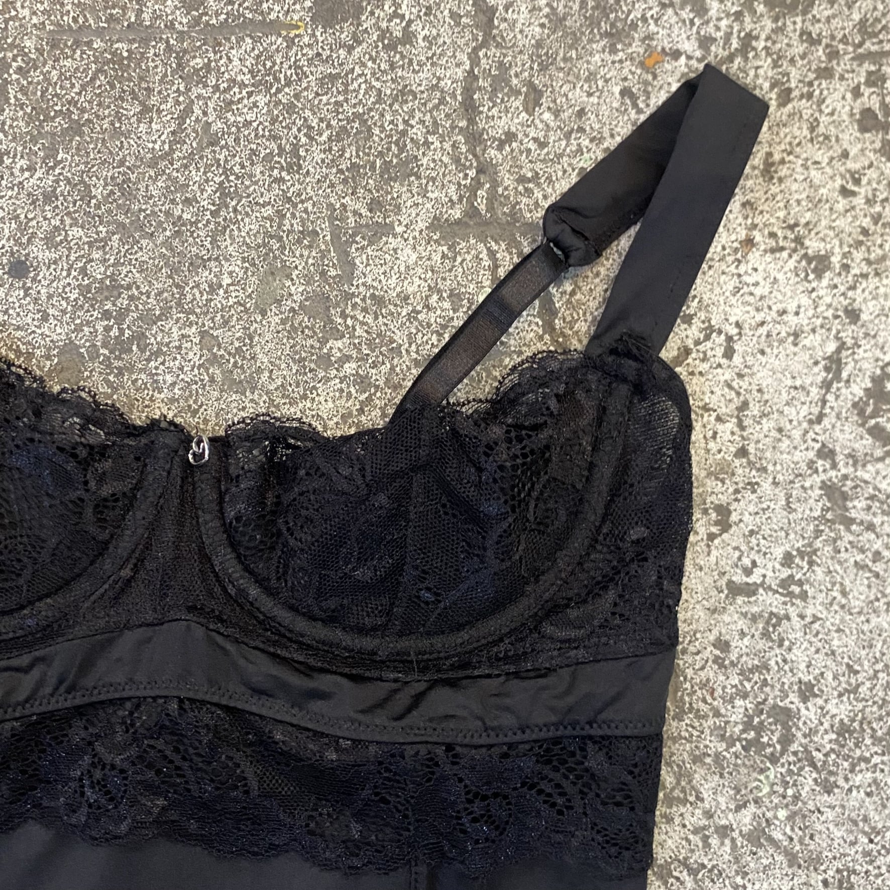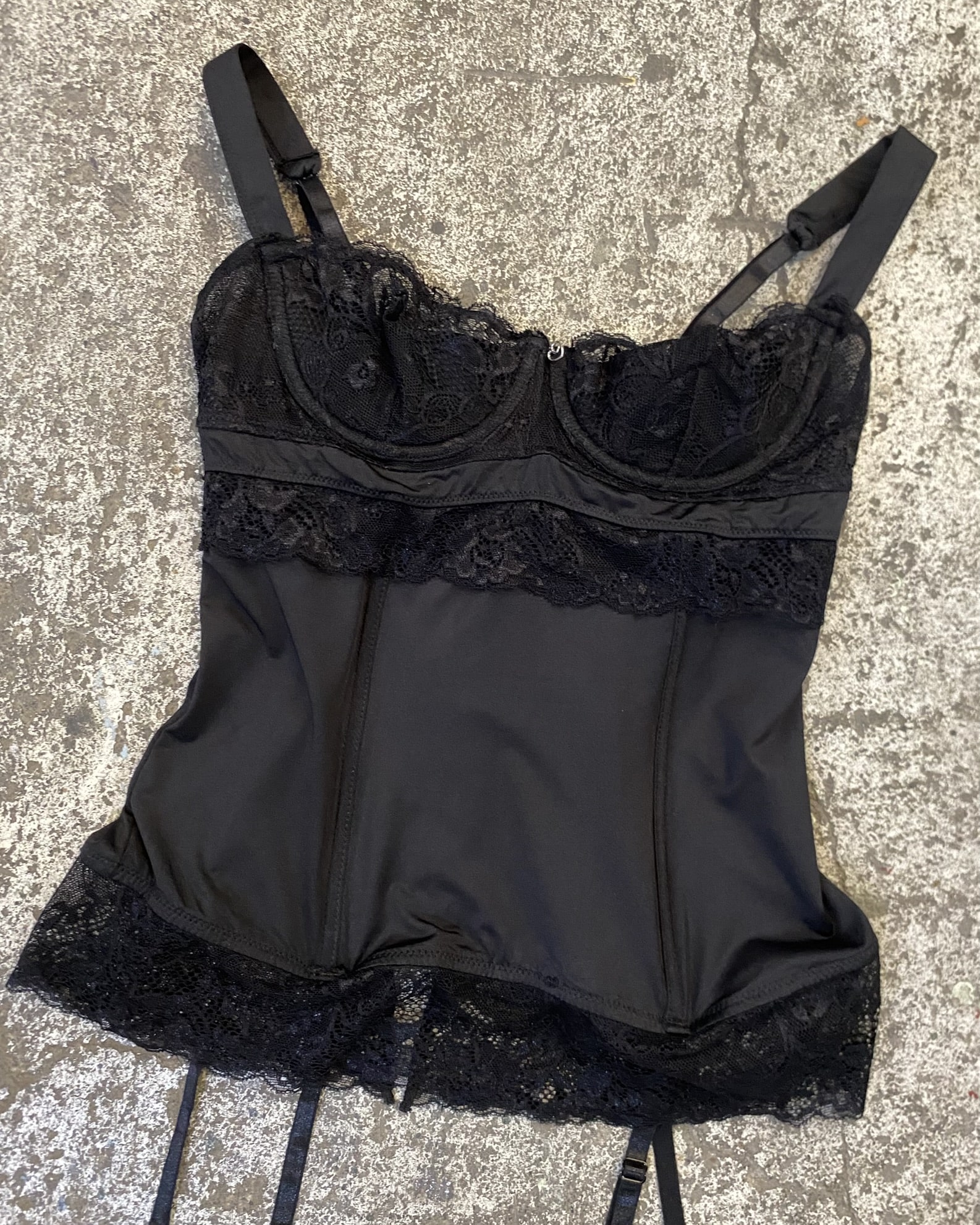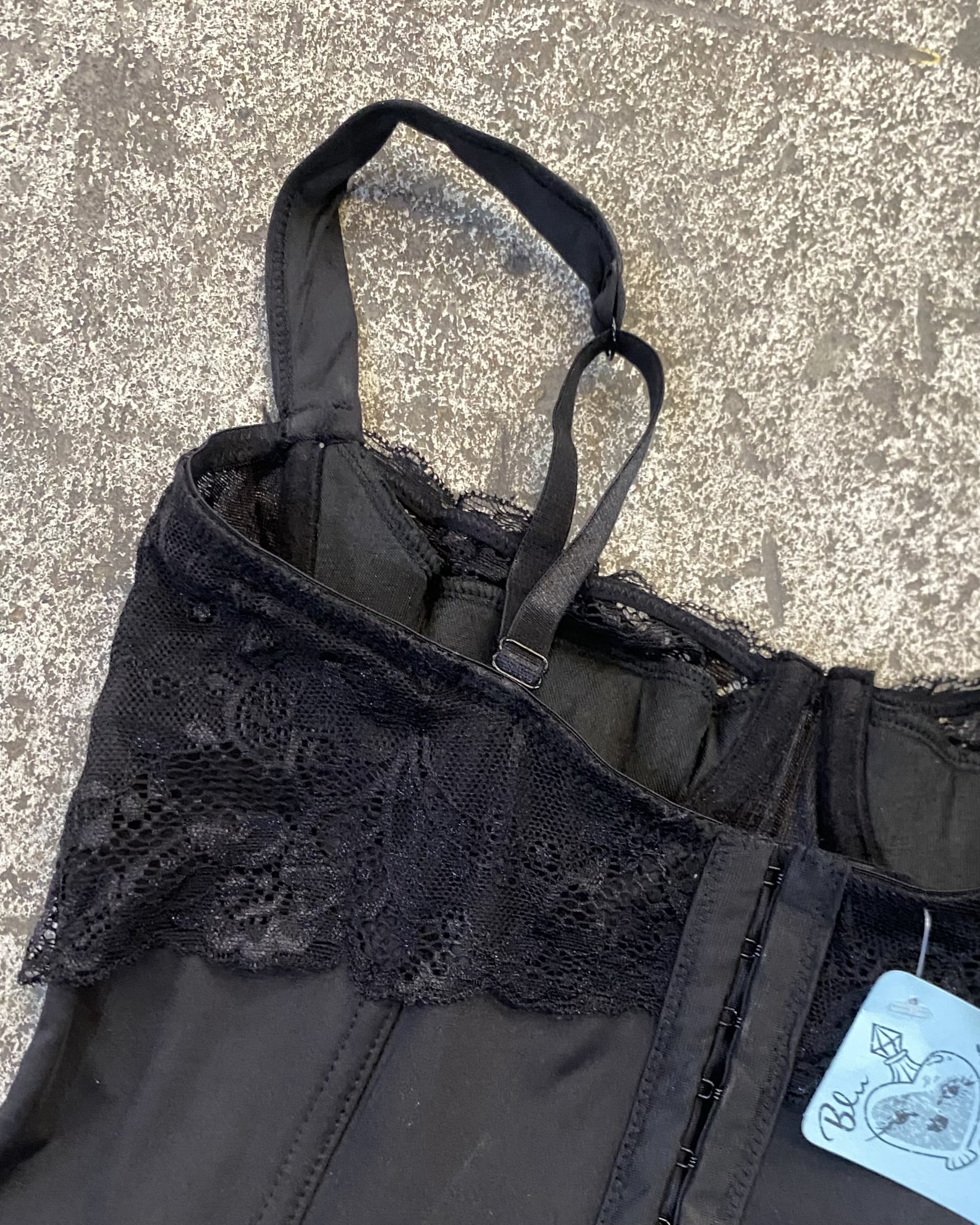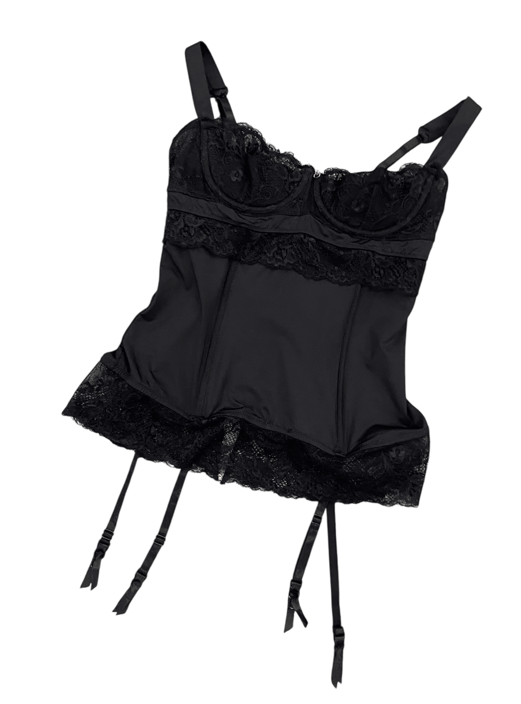 Bustier negro de tirante ancho, con copas de encaje y material elástico, tiene varillas que ayudan a mantener su forma y portaligas