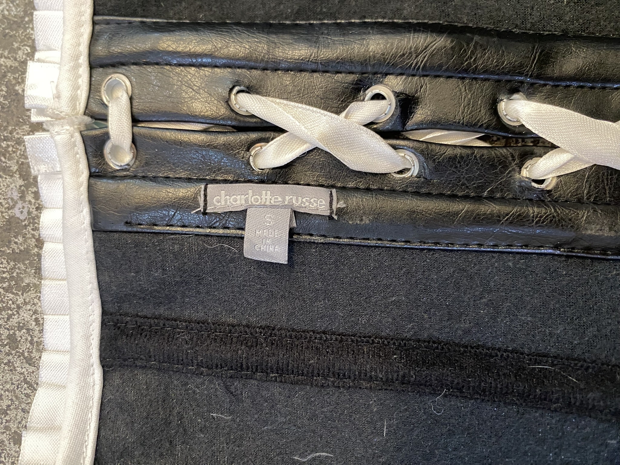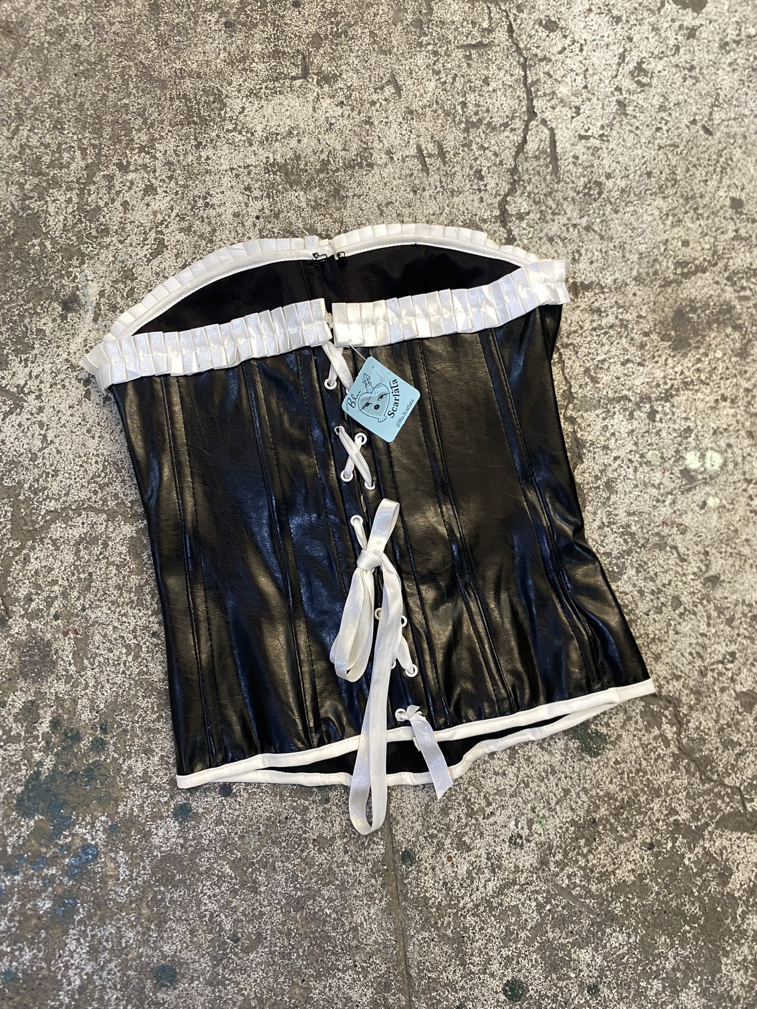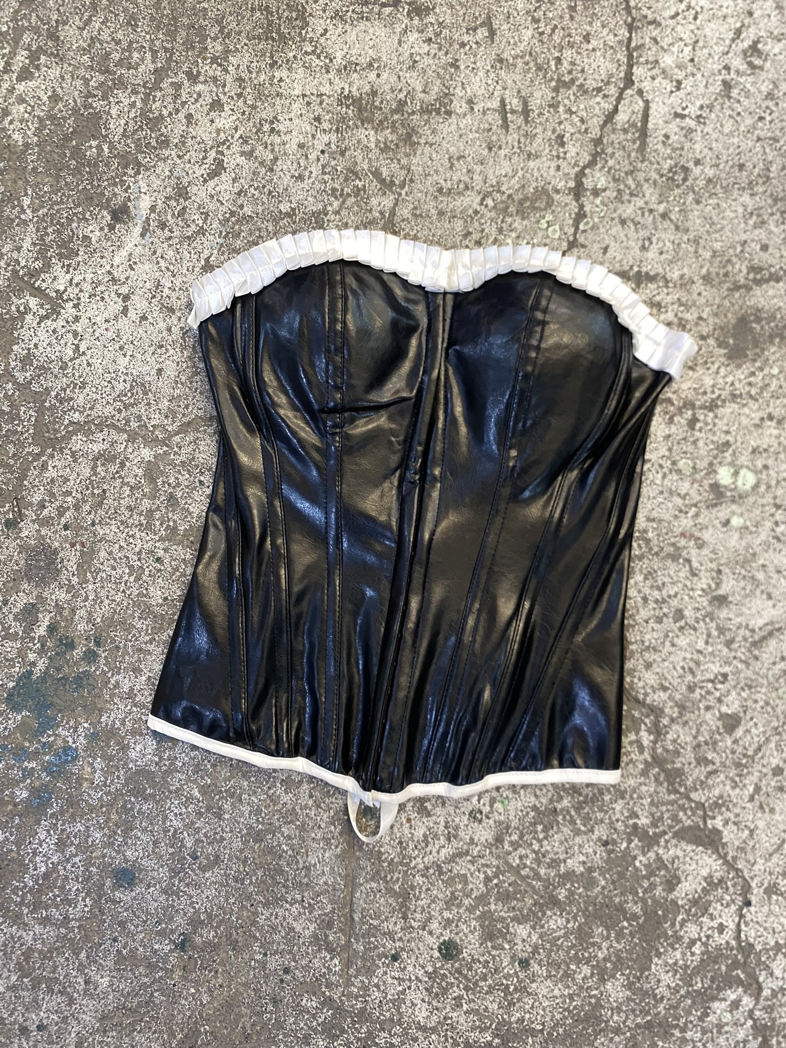 Corset de ecocuero negro con detalles en color blanco, abertura frontal y cintas para ajustar en la parte trasera, marca charlotte ruse