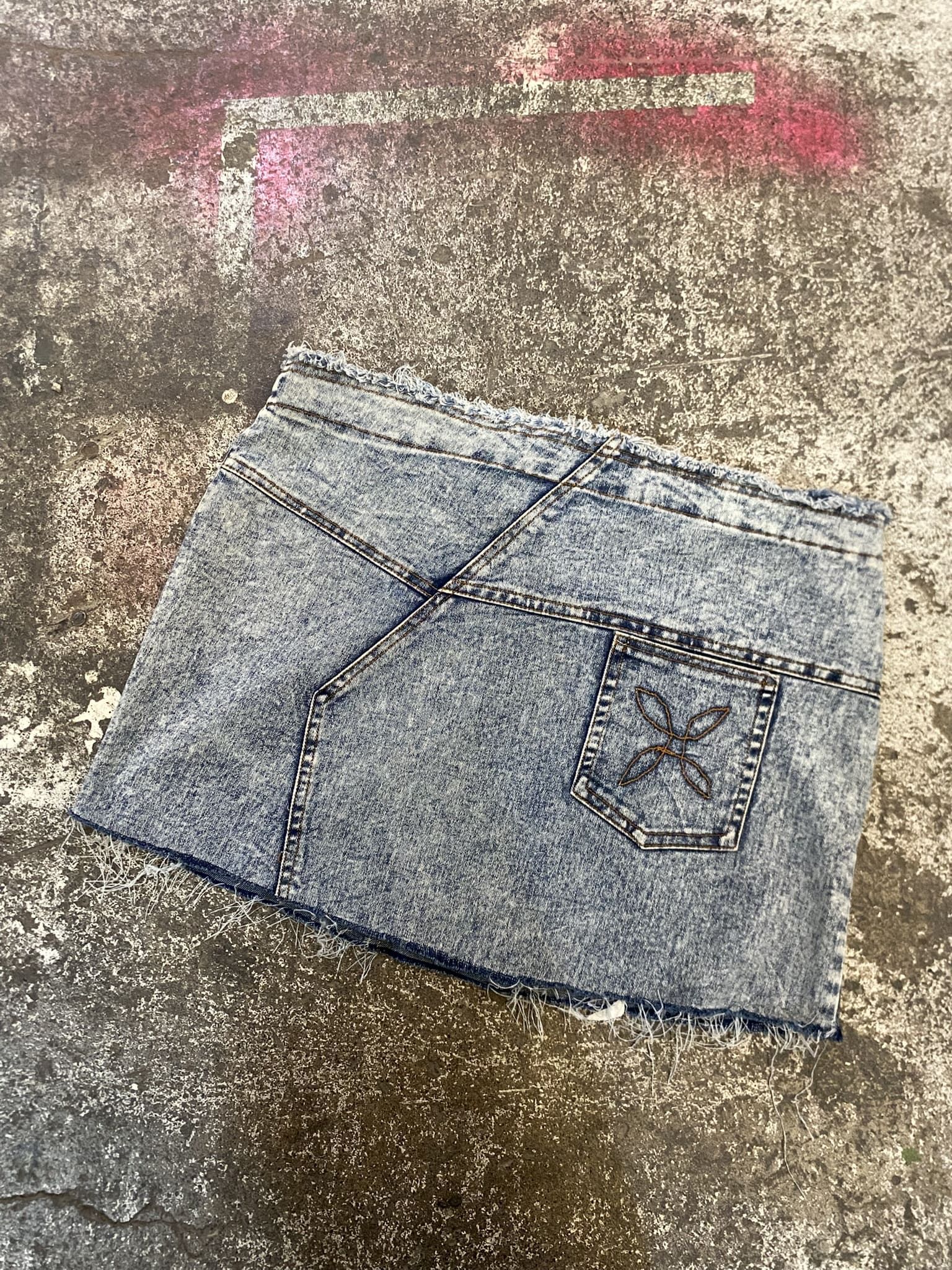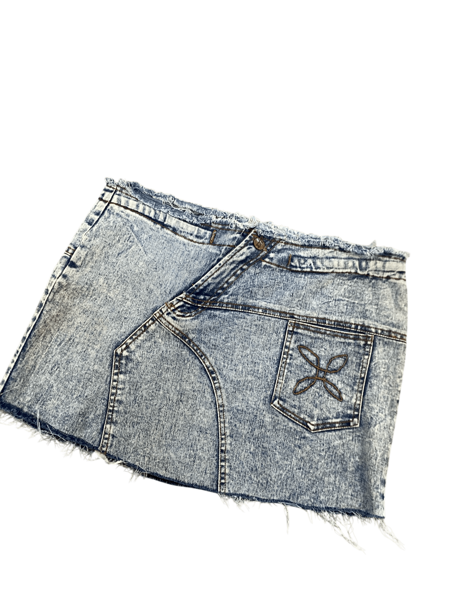 Mini falda de mezclilla nevada con detalles asimétricos y bolsillo